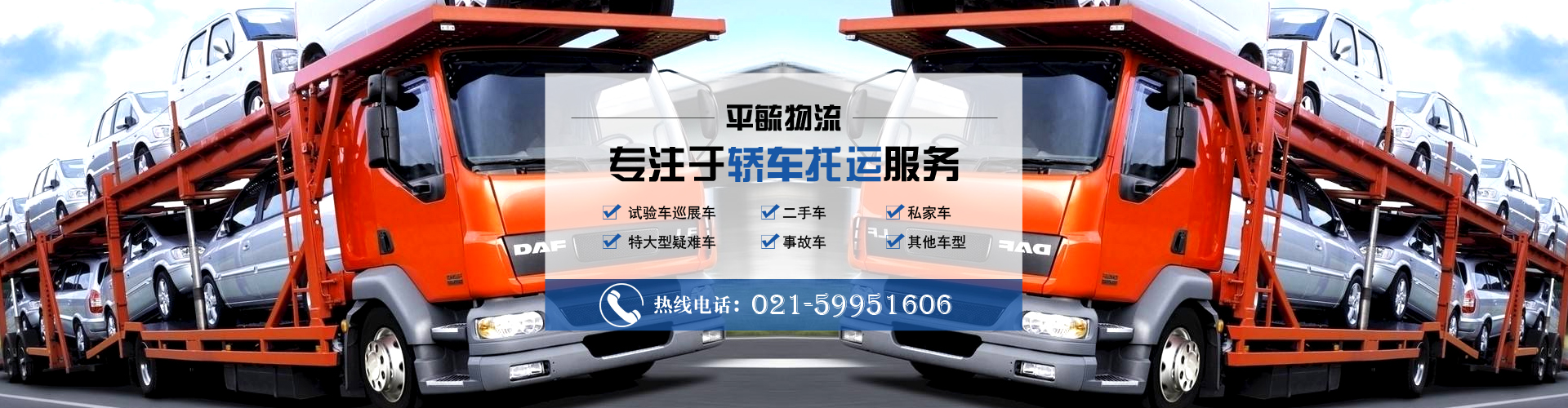 上海平毓物流有限公司:主要以試驗車巡展車、二手車、私家車、事故車、特大型疑難車型的托運業務,北京、沈陽、長春、哈爾濱快速到達。運價低,所運車輛全程保險,運輸車輛全部衛星定位。我們擁有一支強大的運輸隊伍,管理系統實行計算機網絡化,信息化管理。保證了快速、準確及時快捷的運輸任務。